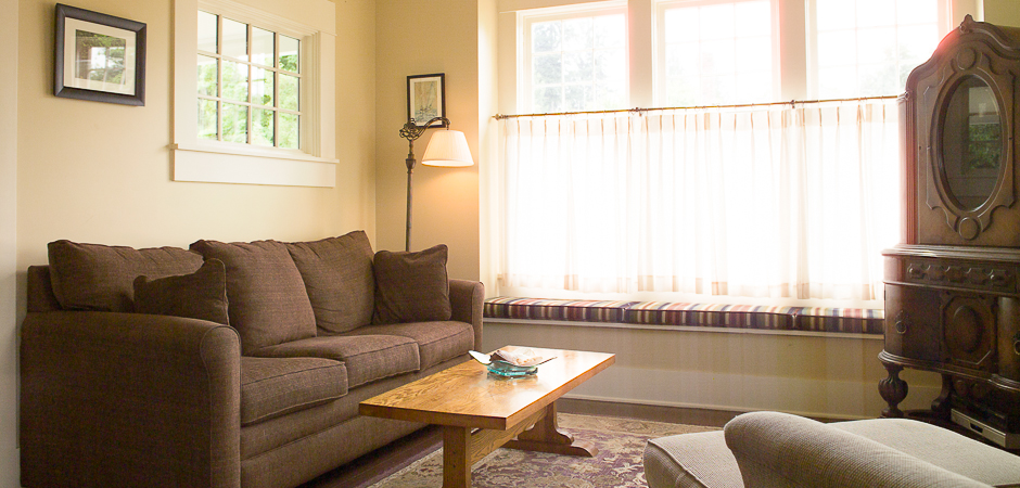 This idyllic and beautifully decorated vacation rental cottage (the brown house) features a three bedrooms, two baths, and can sleep up to eight people. It includes a fully equipped kitchen, dining room, fireplace and living room. All common areas provide beautiful views of the water.